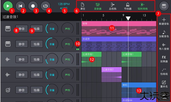 1、可创建乐器、鼓机、采样器和音频四种音轨。