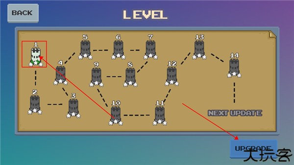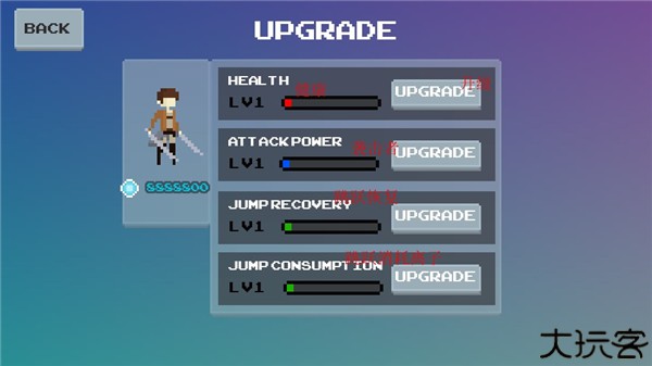1、玩家可在界面中升级人物,解锁更多关卡与战斗能力。