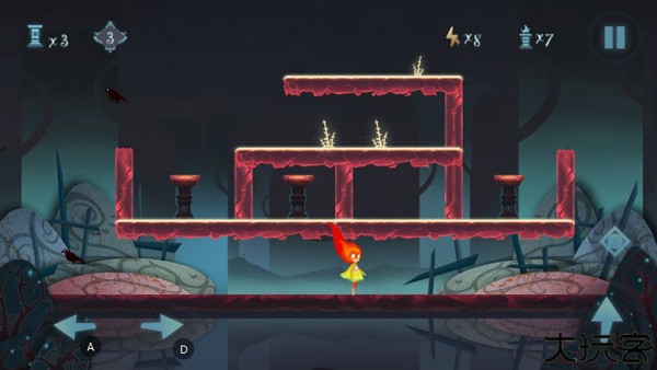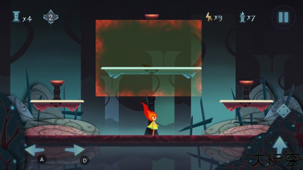 首先我们可以先按住右边屏幕那个菱形按钮打开红色隐藏区域,在屏幕中间向左滑动,会发现隐藏在屏幕左边的灯台,接着按住控制键跳上平台去点燃它们;同理,右边灯台也是这样点燃的。除此之外,一定不要忘记,屏幕中间最高点还有一个灯台哦!可以借助点燃第一个灯台的平台跳上去点燃就可以啦!
