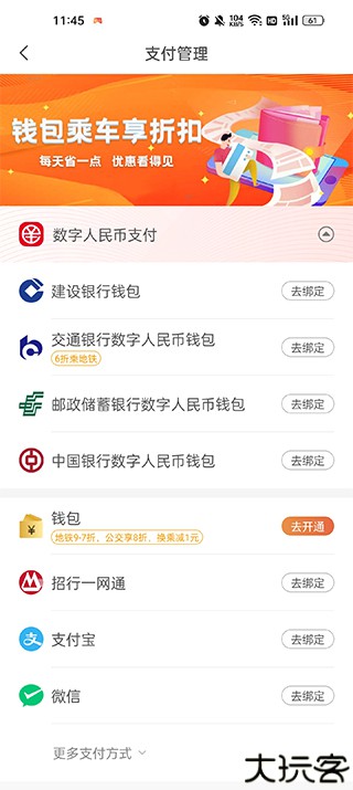 3、系统引导关联银行卡,设置默认扣费方式后即可启用乘车码。