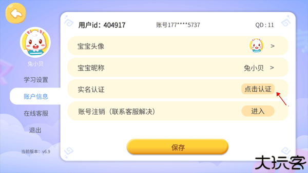 3、默认为学习设置界面,往下点击账户信息,选择右边实名认证的“点击认证”。