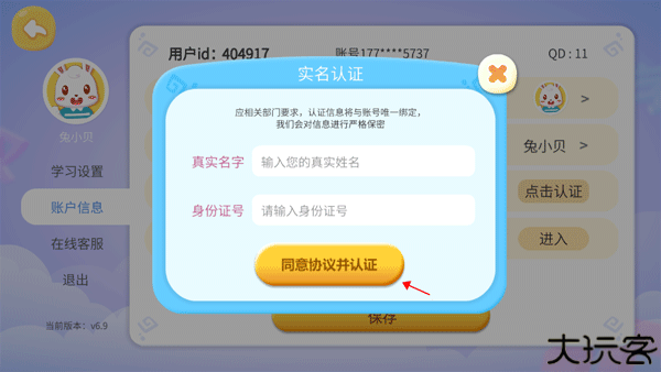 4、输入家长的姓名和身份证号,点击下方的“同意协议并认证”就可以认证成功了。