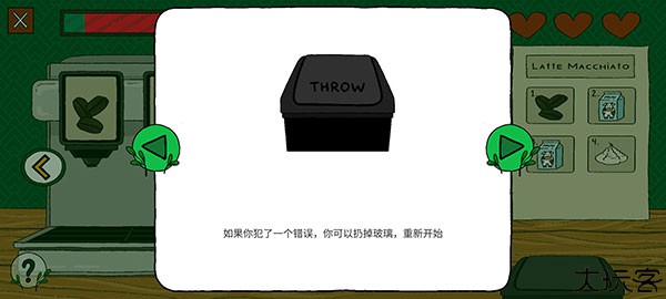 3、如果玩家犯了一个错误,可以拖动玻璃杯扔到垃圾桶,扔掉咖啡就能重新开始制作。