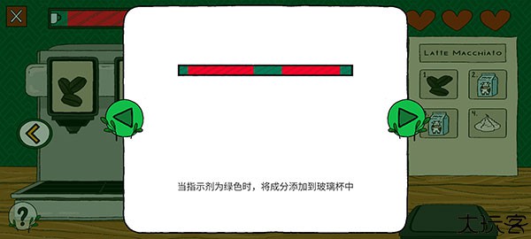 2、当指示剂为绿色时,玩家将成分逐步添加到玻璃杯中,就可以得到正确的咖啡量。