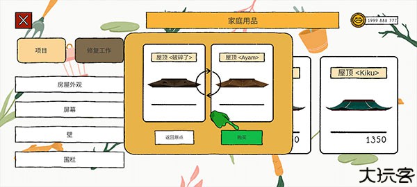 7、点击“修复工作”,再选择家庭用品,随后购买喜欢的屋顶样式就行。