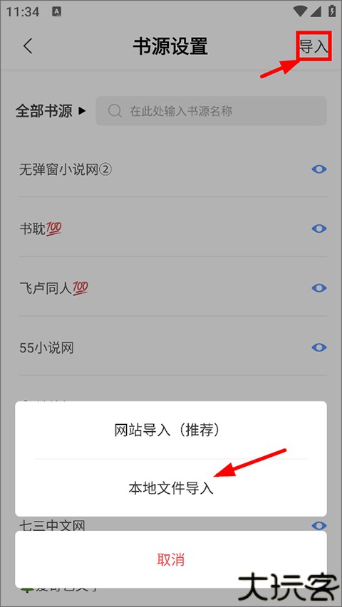 3、能够点击右上角导入,选择导入或本地文件导入书源。