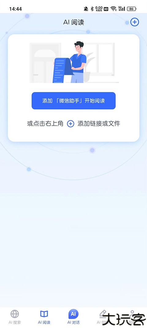 在AI阅读页面中,添加微信助手并与天工APP链接,启动与AI对话功能,了解网页信息。