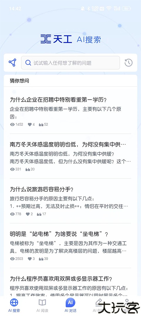 启动应用后,首先进入AI搜索界面,可以在这里输入问题,系统会给出精准答案。