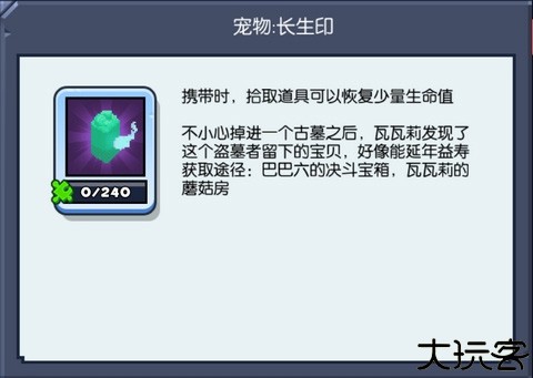 这是瓦瓦莉在不小心掉进一个古墓之中后,无意中发现的,是一个盗墓者留下的宝贝,从其散发的看,好像具有延年益寿的效果,虽然不知真假,但是携带后,的确能在拾取道具的同时恢复少量生命值,这无疑大大加强了在蘑菇岛中生存的几率。