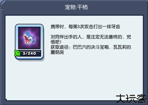 干柿可能是无尽之海中的一只可怜的小鲨鱼,从其眼角滑落的泪水足见其悲惨的幕后故事,就是不知道它与瓦瓦莉手中挥舞着的武器鲨鱼有什么关联。作为攻击型宠物,携带时,每第三次攻击都将打出一排牙齿。这里有一个小彩蛋就是,这排牙齿的攻击对象是谁这里没有明确说明,而从其说明中看是否可以对队友使用?对同伴出手的人,是注定无法善终的,觉悟吧。