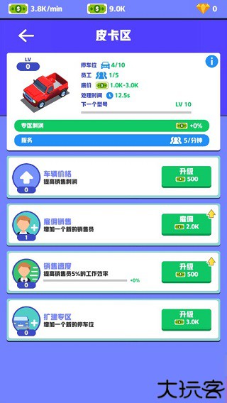 5、玩家需要一个优秀的销售员工来处理这些二手车,点击销售区域,便可在销售区域里,查阅到车辆驾车、雇佣销售、销售速度、扩建赚取等等.