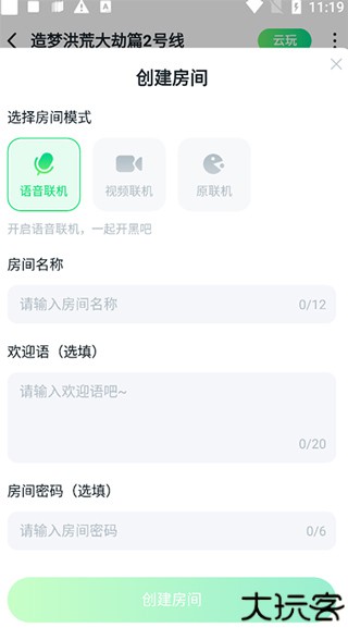 4、需要选择房间的模式,输入房间名称、欢迎语等,也支持设置密码。