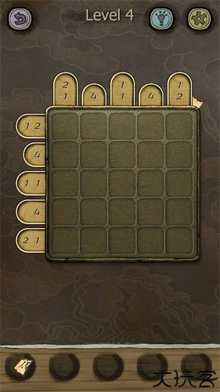 5、其玩法是当玩家看到第一行数字是1,2,代表第一行有一个一连和一个二连,第二行数字是4,代表第二行只有一个四连,列也于此相同。所以答案是: