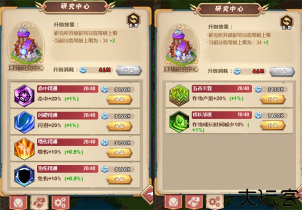 2、农场科技分为前期、中期、后期。能够升多少级是根据获取农场资源的速度决定的。