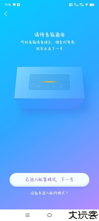2、音箱接电待语音响起,橙灯常亮后点击继续进入下一步。