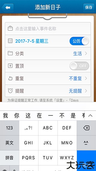输入事件名称,设定日期(支持阴阳历),分类及提醒后保存。
