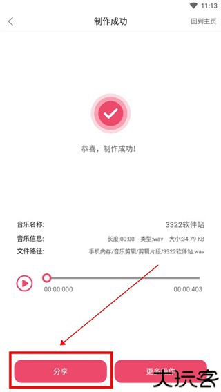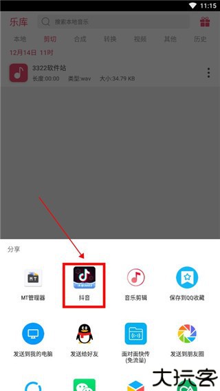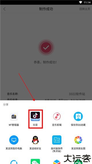 音乐编辑完成后,点击下方“分享”按钮,选取抖音图标上传。