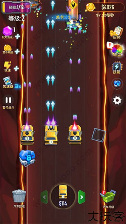 2、点击购买两辆同级汽车,可以合并变成一辆高级车,这样火力就能变得更加厉害。