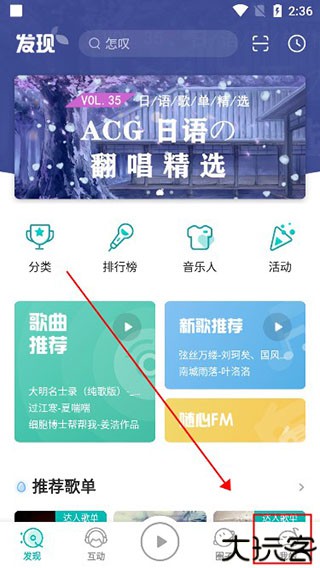 1、分为原创、翻唱、伴奏、音乐人、圈子、活动、电台、排行榜等板块。