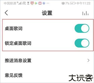 2、点击设置标识,在设置页面,点开桌面歌词按钮。