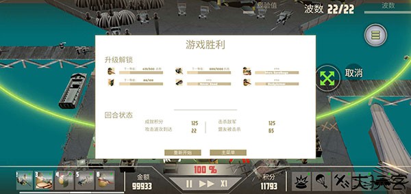 6、玩家需要坚持到最后一波结束,以保证指挥官的血量不低于0%即可获得游戏胜利。