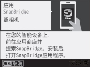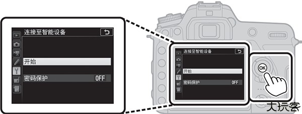 2、照相机设备能在设定菜单中选择“连接至智能设备”,然后在加亮显示开始并按下ok键