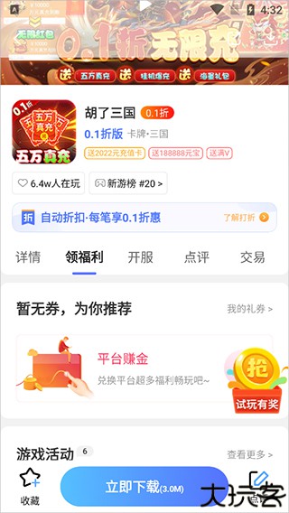 2、可以点击直接进入详情页面,点击下载游戏和领取游戏福利。