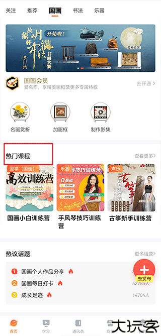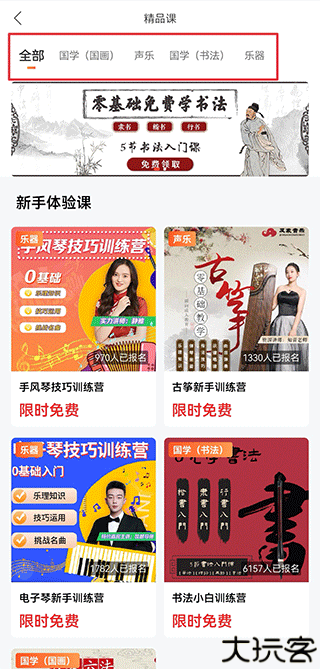 2、进入精品课后,选择国画、声乐、书法、乐器课程。