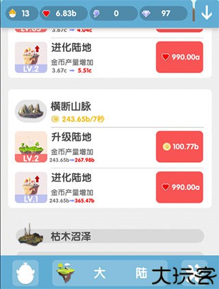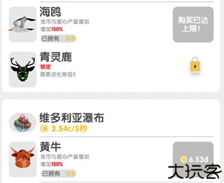 2、需收集爱心来进化陆地,提升其产量,进而购买更多小动物。