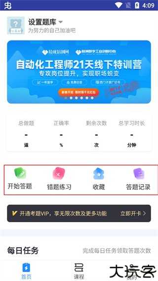 进入首页可查看练题入口、错题区及历史答题,便于反复巩固。