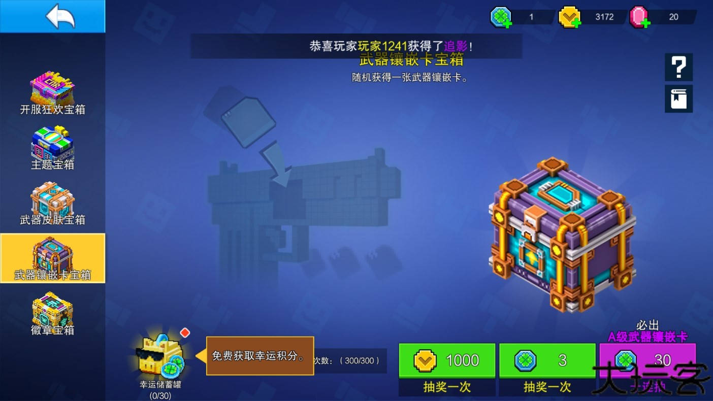 2、武器皮肤宝箱,前期建议多开,开出的如果是新皮肤那自然是最好不过了,如果是已有的则可以自动转化成武器碎片,武器碎片是游戏后期很重要的材料,可以强化自定义武器,非常有用一定要留着,这里再次强调。 武器皮肤宝箱这里一定有3个宝箱,每个宝箱中有2个S级的皮肤,如果抽到其中一个还可以得到一个头像框,还是蛮好看的。