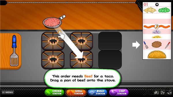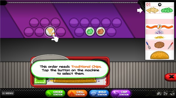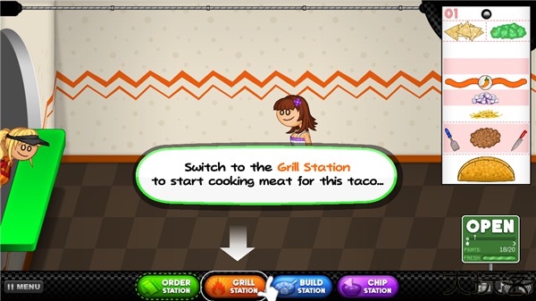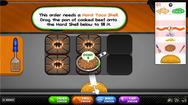 老爹的塔可店中文(Papa's Taco Mia)是经典的餐厅模拟经营游戏,玩家管理一家塔可店(卷饼店),需要制作顾客的塔可,赚取金币,用来升级店铺,让它成为小镇的热门店铺。每个顾客的订单都需要玩家亲自操作。首先,把肉放进锅里烹饪,并注意翻面时机。肉煮熟后放进卷饼里,按照顾客的口味添加不同配料,再加上一些脆片和新鲜沙拉,就可以完成订单。此外,玩家在老爹的塔可店中文中还可以收集更多食材,搭配出各种美味的塔可,吸引更多顾客光顾。