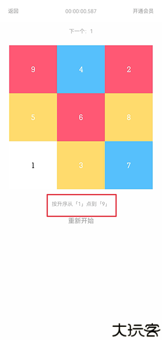 2、根据提示,依次快速点击数字1到9,保持升序完成。