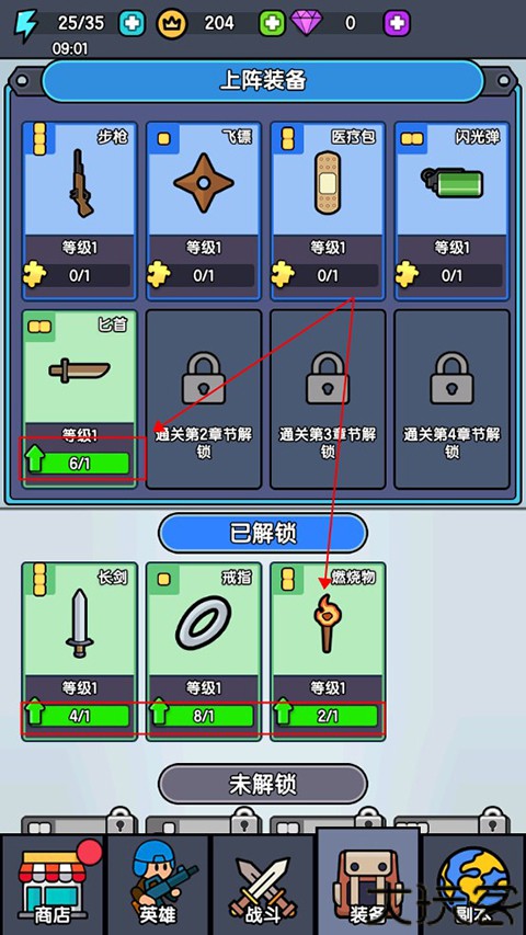 7、通过关卡之后,玩家可以获得大量装备,而这些装备都可以进行升级提升,增加等级和战力。