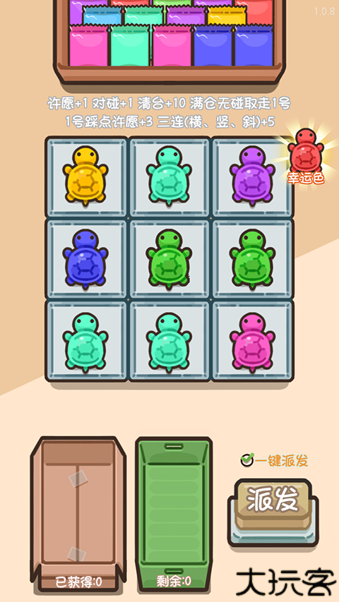 2、拆出两个同色的乌龟会触发对碰,能够额外获得一个订单。
