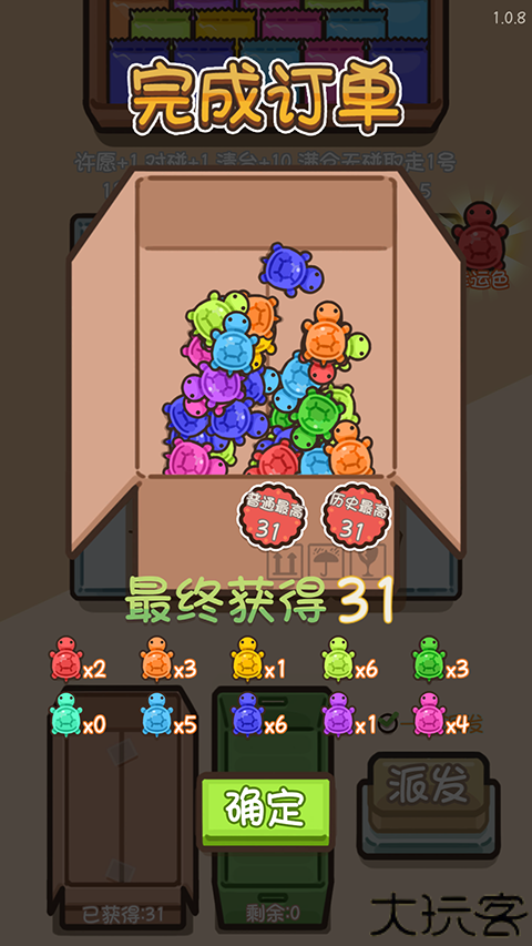 5、如果玩家连续五次都拆出不同颜色的乌龟会触发清台,其中玩家可以获得5个订单,订单耗尽后游戏结束。