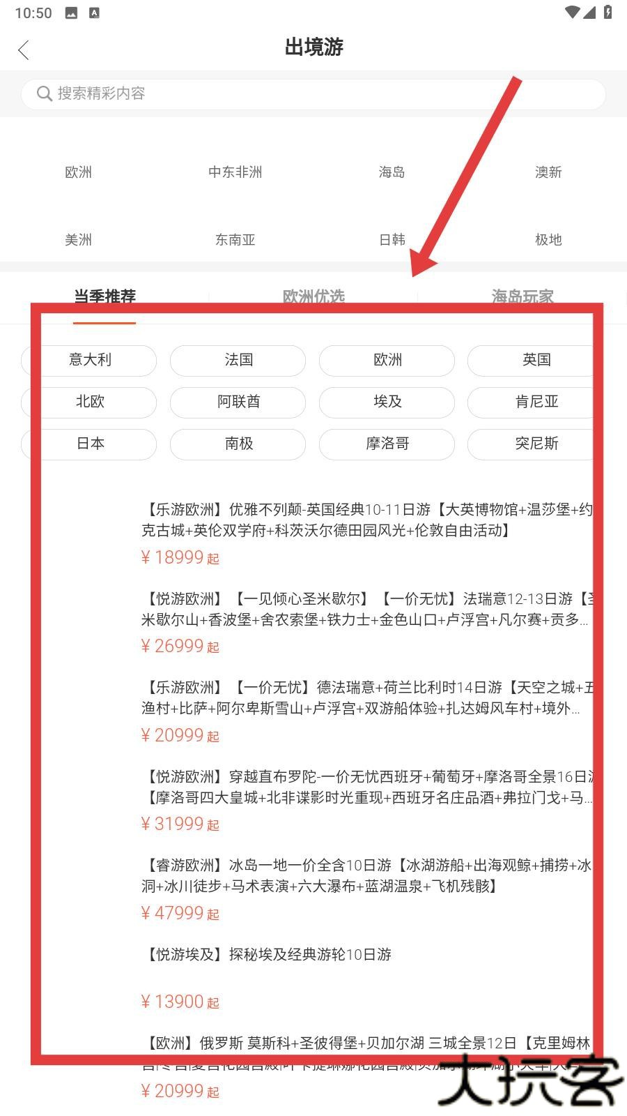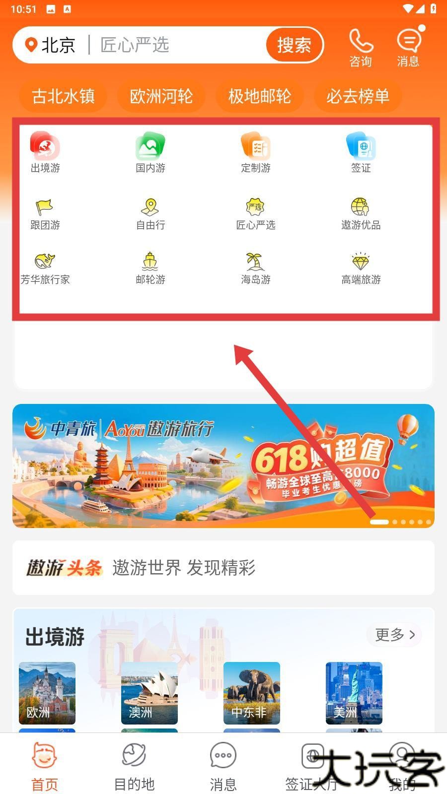 2、可以去找到功能区包含出境游、国内游、定制游等,点击出境游进入页面。