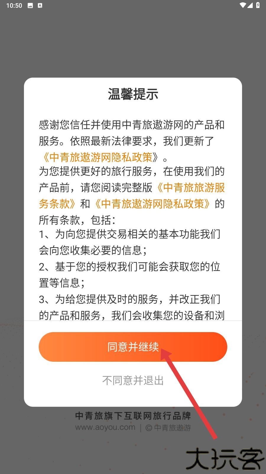 1、打开中青旅遨游精品旅行,会弹出温馨提示仔细阅读内容,在去点击同意并继续进入首页。