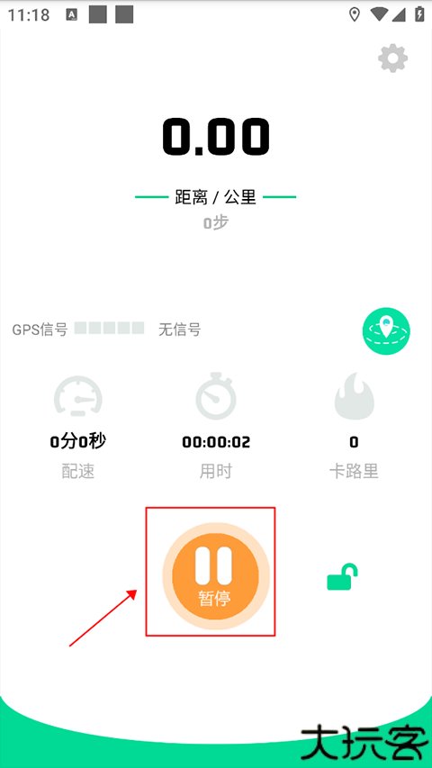 3、用户点击后就可以开始不断跑,软件在跑步时会不断记录用户所跑的公里数、步数、速度、时间、卡路里消耗等数据,完成跑步后点击暂停按钮。