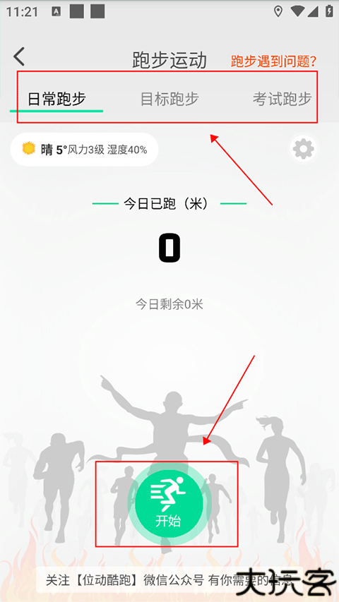 2、用户进入跑步运动界面后,可选择日常跑步、目标跑步或考试跑步后,点击开始按钮。