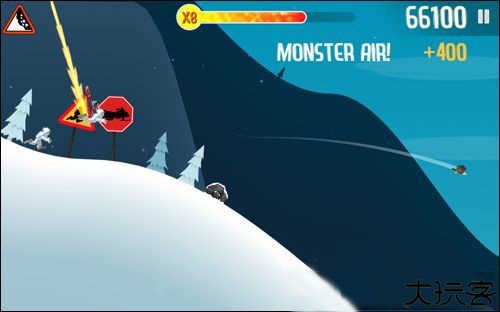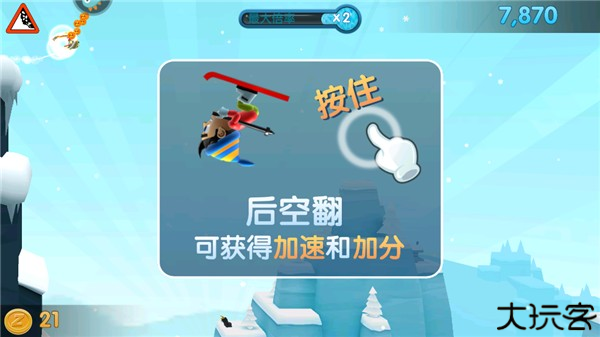 老鹰是个好东西,它可以帮玩家长时间滞空,甚至还能向上飞。但是因为老鹰一直在空中,想骑上它可不容易,而且老鹰出现的频率也不高。假如你骑上它了,那么别犹豫了,赶紧向上飞,在滞空的时间里,多翻几个跟头,落地后就会获得几倍的加速。安趣小编最多翻过五个跟头,直接加速到八倍!但是着陆是一门学问,要控制好滑板的角度以及着陆时的切入点,要不然很容易就被埋掉,甚至连加速效果也一并消失,那就得不偿失了。