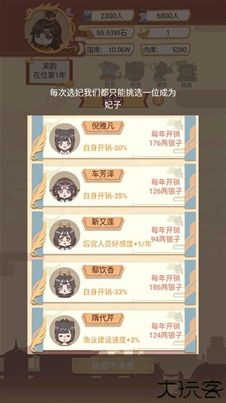 4、可以进行选妃,只能挑选一位成为妃子,没有选中的也会进入皇宫。