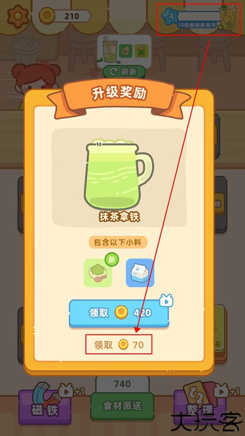 4、完成订单还能获得经验奖励,提升等级,升级可以解锁更多奶茶卡片以及金币。