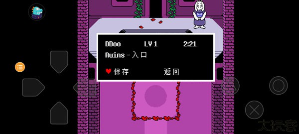 3、跟随着Toriel前往至遗迹的入口,在花丛当中会遇到第一个保存点(星星)。Toriel不假思索地告诉你这里就是玩家的新家。进入到第一个存档点北面的房间,Toriel会亲自把这个房间的谜题给解决,所以直接穿过北面的门即可。随后进入到东西向并且有两条小溪长廊上,Toriel需要你去拉下墙上有标记的杆子,一共需要拉下两个,那么东面的尖刺陷阱就会被移除。
