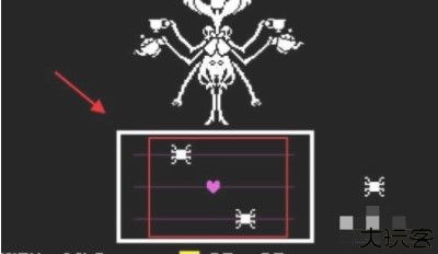 5、去到北面的藤蔓房间内会遇到青蛙froggit,选择“行动——赞美”,虽然青蛙不知道玩家在说什么,但他变得很开心,他就会逃离战斗。在右面的水池上有一个尖刺陷阱,Toriel会牵着玩家的手通过这个陷阱区域。