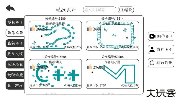 4. 各种不同游戏水平的关卡都展示在玩家面前,面对不同的挑战,可以选择不同的操作技巧。
