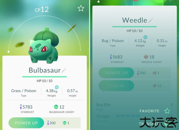 5、抓到的神奇宝贝可以在图鉴中检视,可以进行强化或是进化。强化宝可梦需要「星尘」与「糖果」,以提升战斗力与生命值。进化则需要耗费不少「糖果」,且要收服相同种类的宝可梦才行,进化后宝可梦的型态也会改变。如果抓到重复的宝可梦也可以点选「TRANSFER」将宝可梦换成「糖果」。
