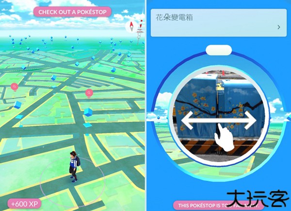 6、路上会有许多蓝色方块那就是所谓的宝可梦驿站,靠近并点击后出现放大图,对着照片滑动旋转就可以获得重要的经验值、宝贝球、药剂、蛋等奖励道具。使用过的驿站在5分钟之后可以再度使用。