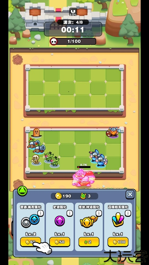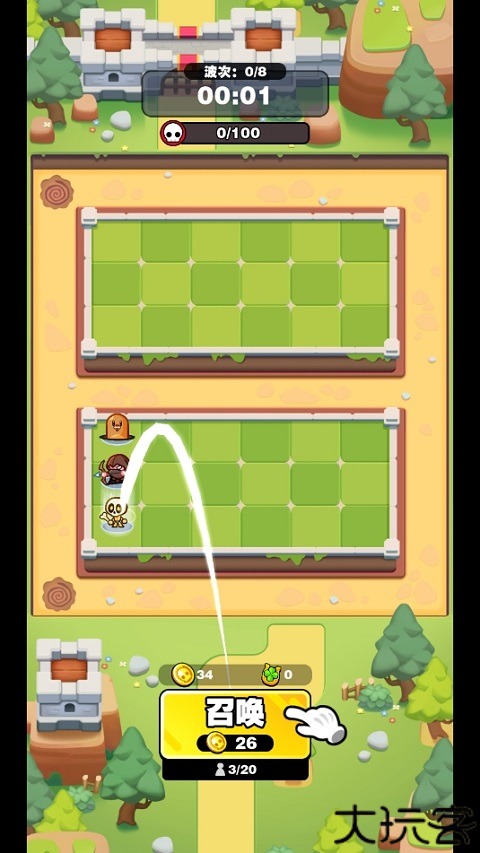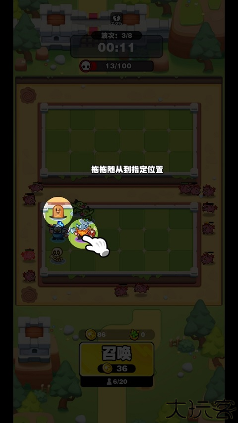 1、消耗金币召唤随从,他们能协助清理怪物与敌军。
