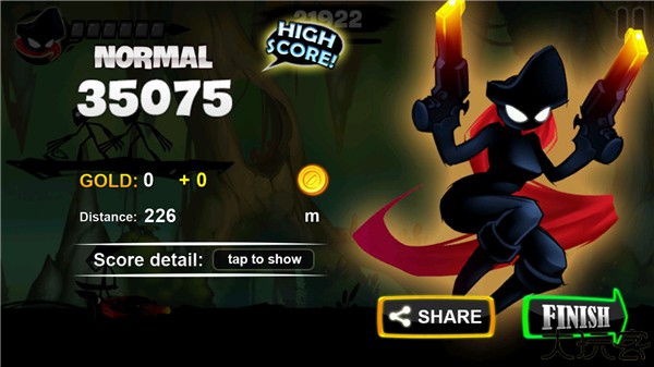 3、滑动屏幕控制角色行进,途中可拾取金币与道具。
